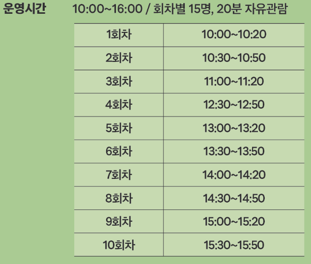 - 10:00 - 16:00 / 회차별 15명, 20분 자유관