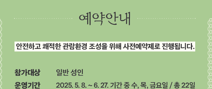 - 안전하고 쾌적한 관람환경 조성을 위해 사전예약제로 진행됩니다.