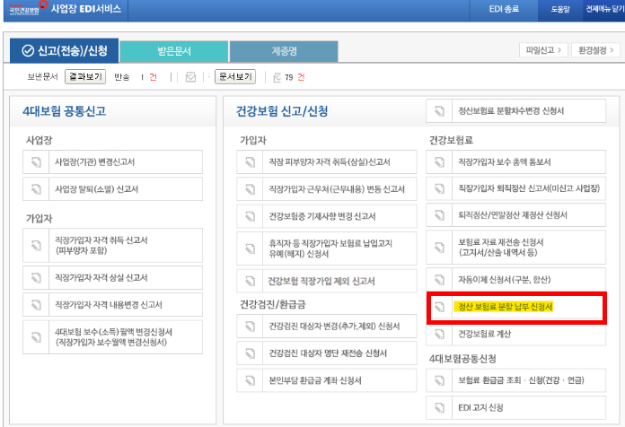 EDI에서 [서식닫기] → 정산 보험료 분할 납부 신청서 클릭