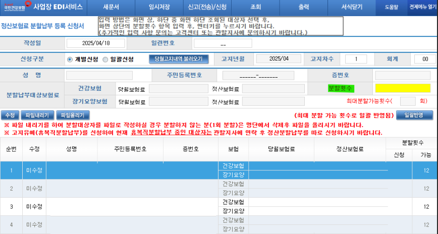 → '당월 고지 불러오기' → 분할 대상자 선택 후, 분할횟수 입력