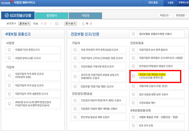 - 보험료 자료 재전송 신청서 선택