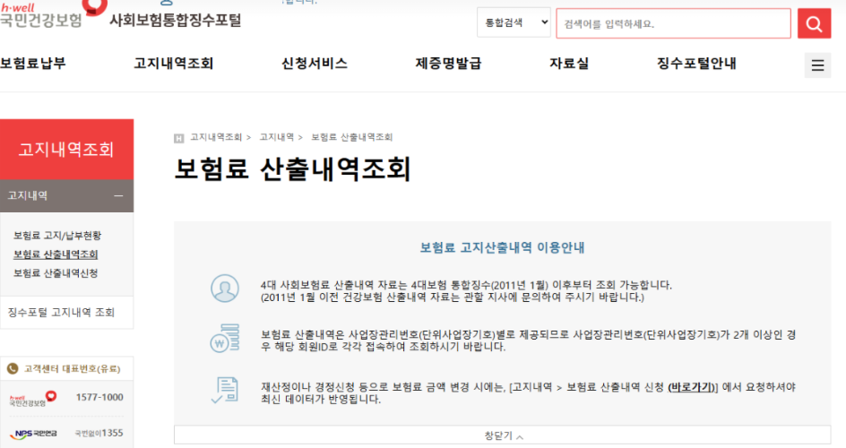 경로: [사회보험통합징수포털] → [고지내역조회] → [보험료 산출내역조회]