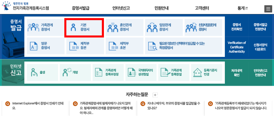 기본증명서 인터넷 발급 방법 (대법원 전자가족관계등록시스템)