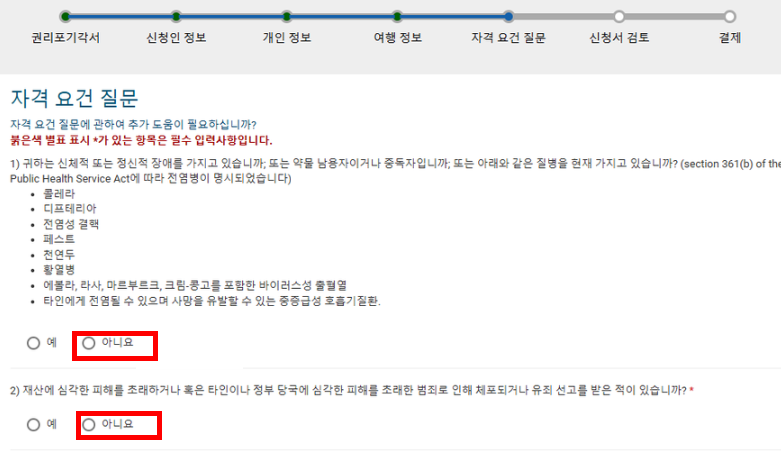 자격 요건 질문 – ‘아니오’
