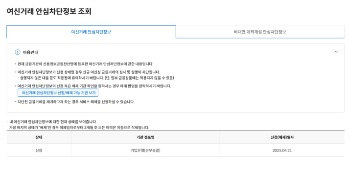 - 한국신용정보원 누리집 → '본인 신용정보 열람' → '안심 차단 정보' 조회