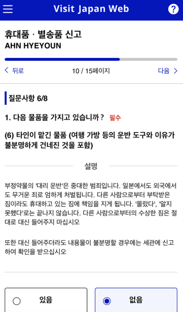 - 일본 내 연락처(호텔 전화번호 또는 본인 휴대폰 번호)