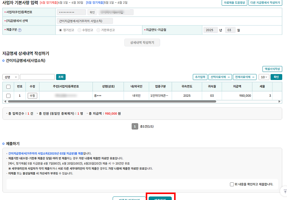 - 정기신고 : 지급일이 속하는 달의 다음 달 말일까지 제출하는 경우