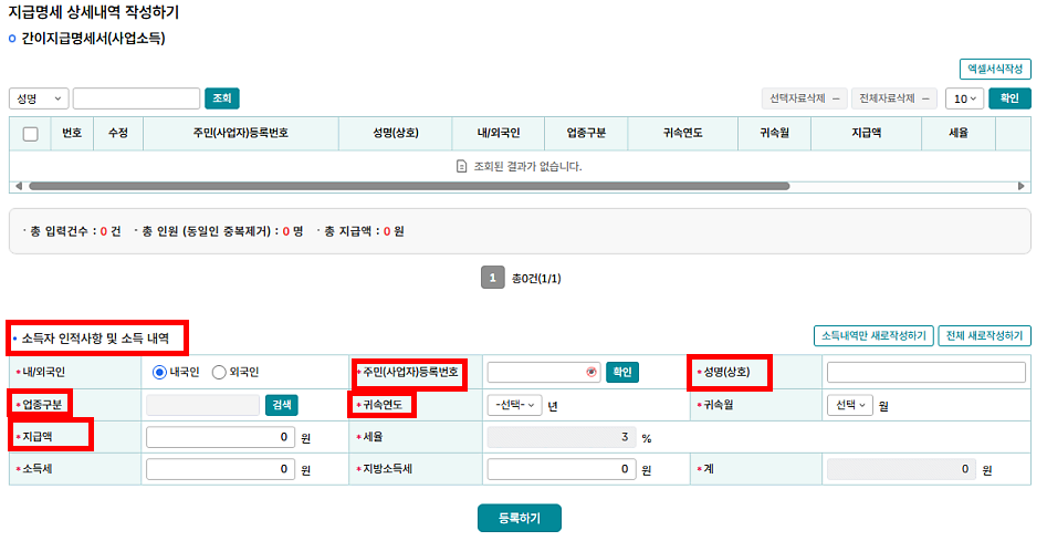 - 수정신고 : 정기신고로 지급명세서를 제출 했는데 수정이 필요한 경우(이미 제출한 지급명세서가 있어야 함)