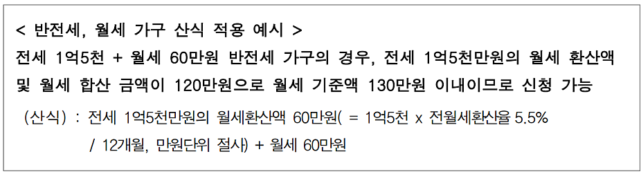 💡 반전세의 경우 전세 환산금 + 월세 합산이 130만 원 이하일 때만 신청 가능