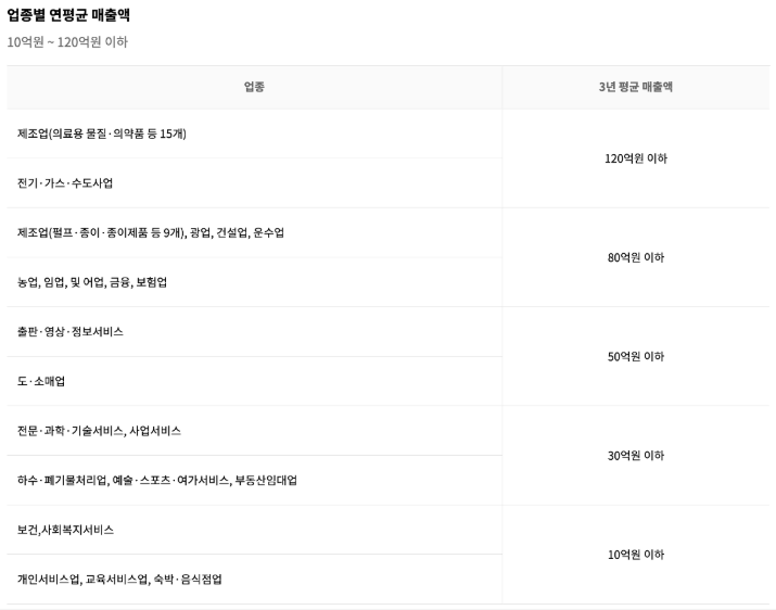 | 도·소매업, 서비스업 등 | 80억 원 이하 |