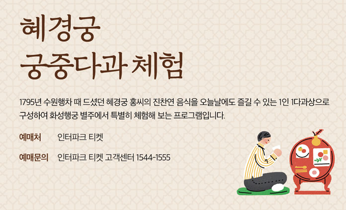조선 후기 대표 여성 인물 혜경궁 홍씨의 회갑연 상차림을 현대적으로 재현한 문화 체험입니다.