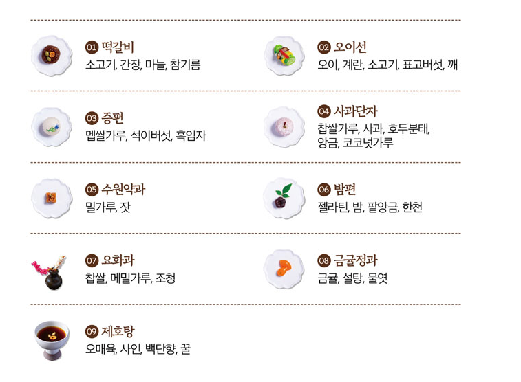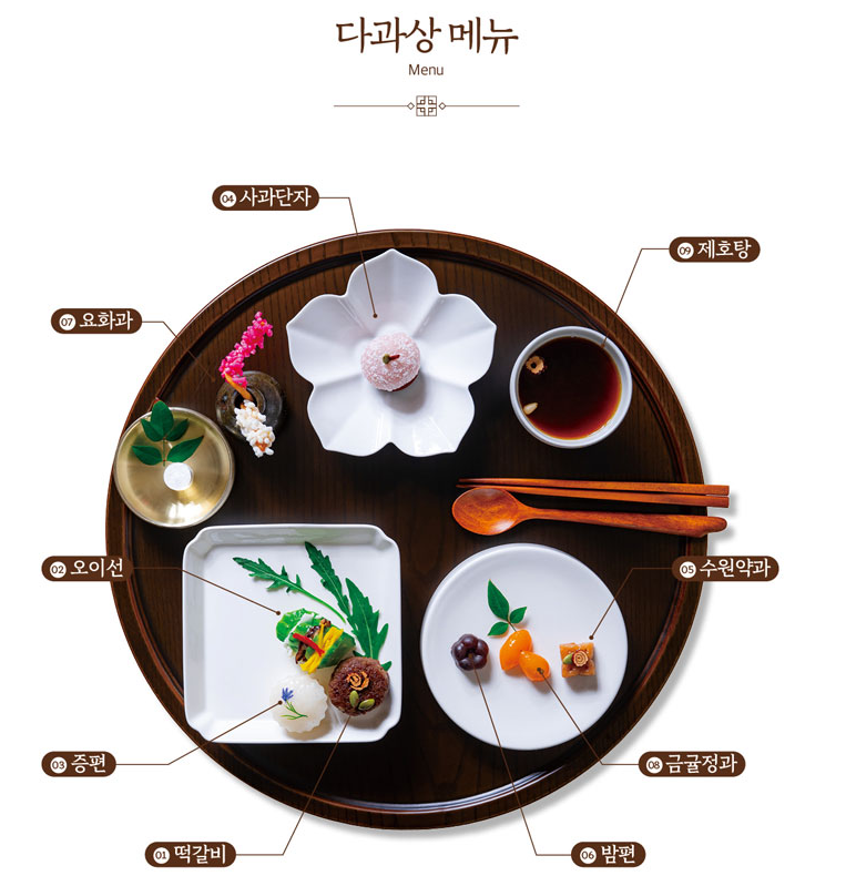 화려하면서도 정갈한 궁중 다과상에는 다음과 같은 메뉴가 포함됩니다: