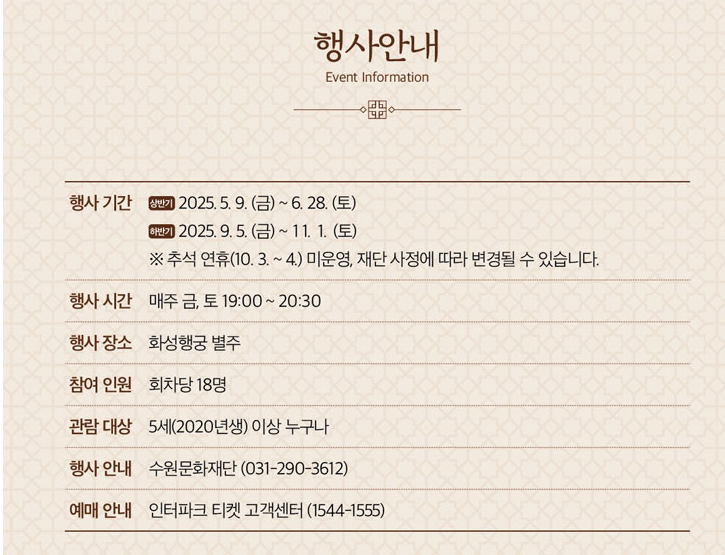 왕실의 품격과 수원의 역사적 정취를 함께 느낄 수 있는 특별한 프로그램입니다.