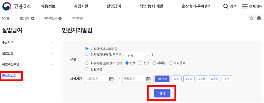 - [이직확인서 처리현황] 메뉴에서 ‘검색’ 클릭