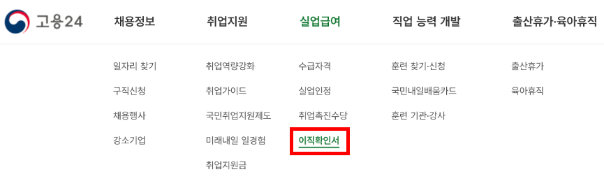 - 로그인 후 상단 메뉴에서 [실업급여] > [이직확인서] 클릭