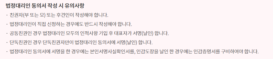 - 법정대리인 인감증명서(또는 본인서명확인서, 전자본인서명서)
