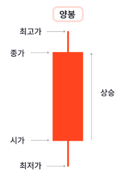 - 양봉(붉은색): 시가보다 종가가 높은 경우