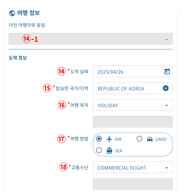 기존 여행자를 선택하면 ⑭~㉕까지의 정보가 동일하게 일괄 입력 됩니다.