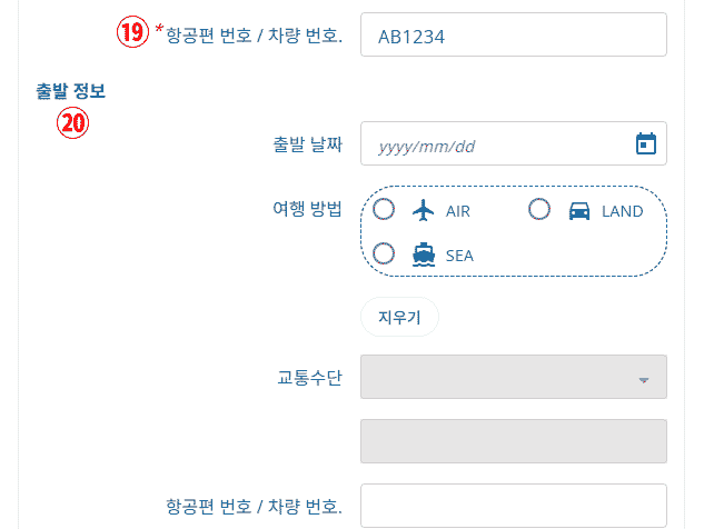 ⑰ 입국시 교통수단을 선택합니다.