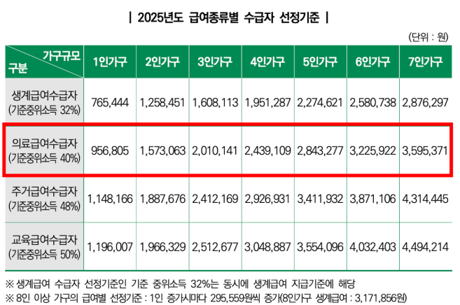 2025년 기준 중위소득 40% 이하인 경우 해당됩니다.