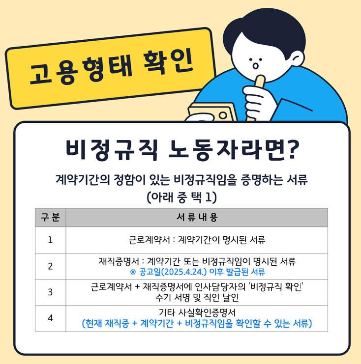 - 근로계약서, 재직증명서 등 (고용형태 확인)