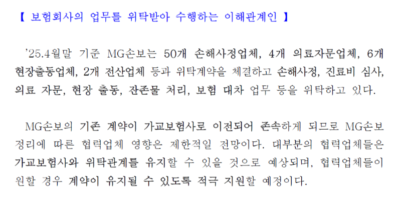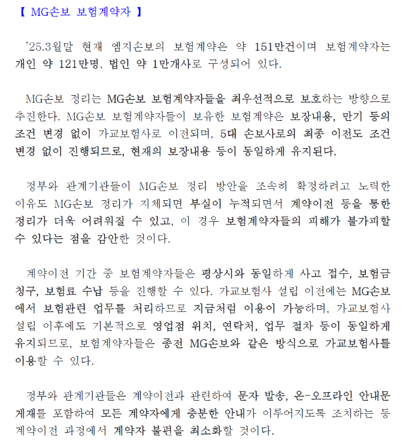 - MG손보 계약 전부를 조건 변경 없이 가교보험사로 이전