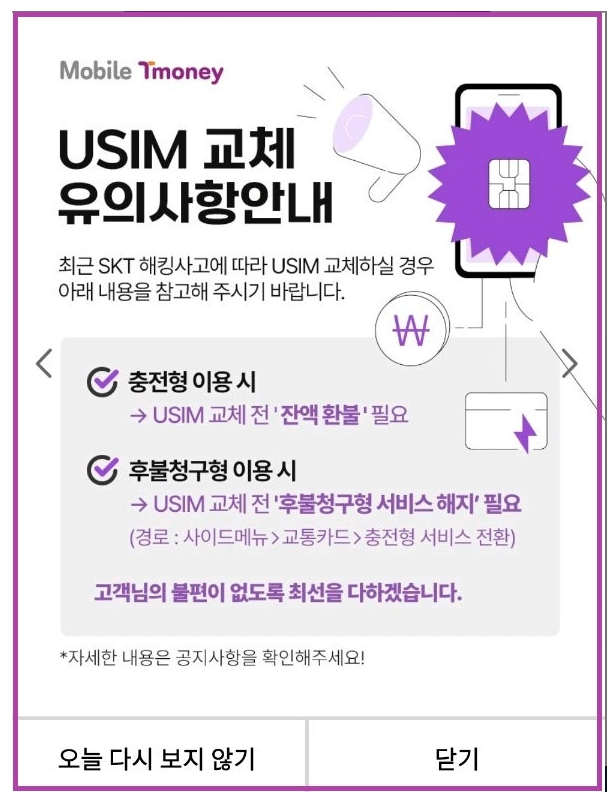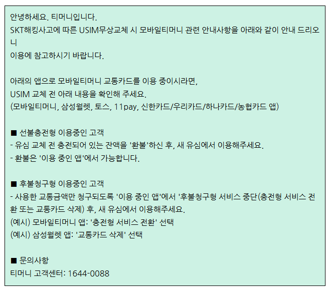 SKT 유심 교체는 무료지만, 티머니 잔액은 복구가 안됩니다.